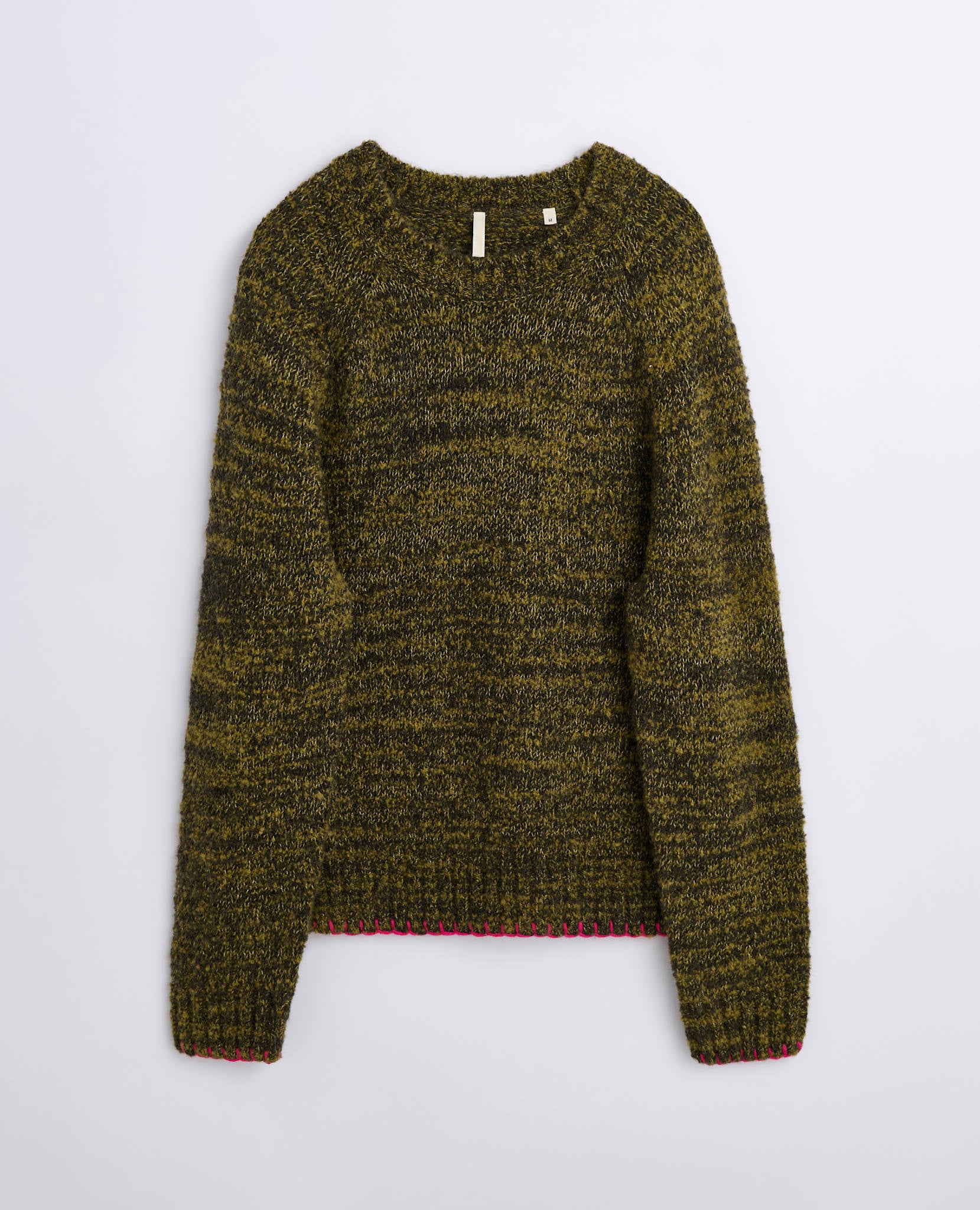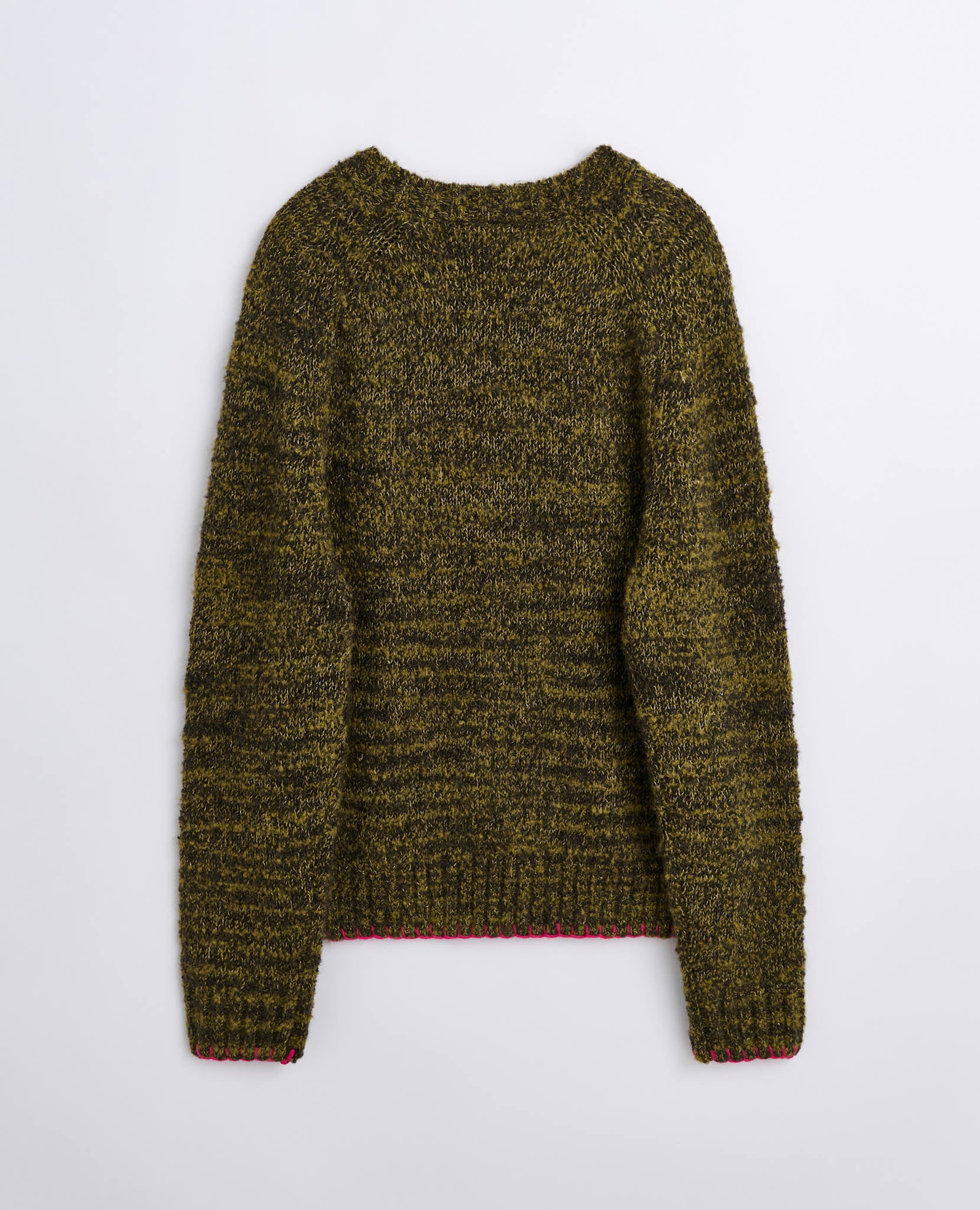 Crew neck knit with raglan sleeves in a heavy gauge moulinex yarn and hand made contrast stitching.