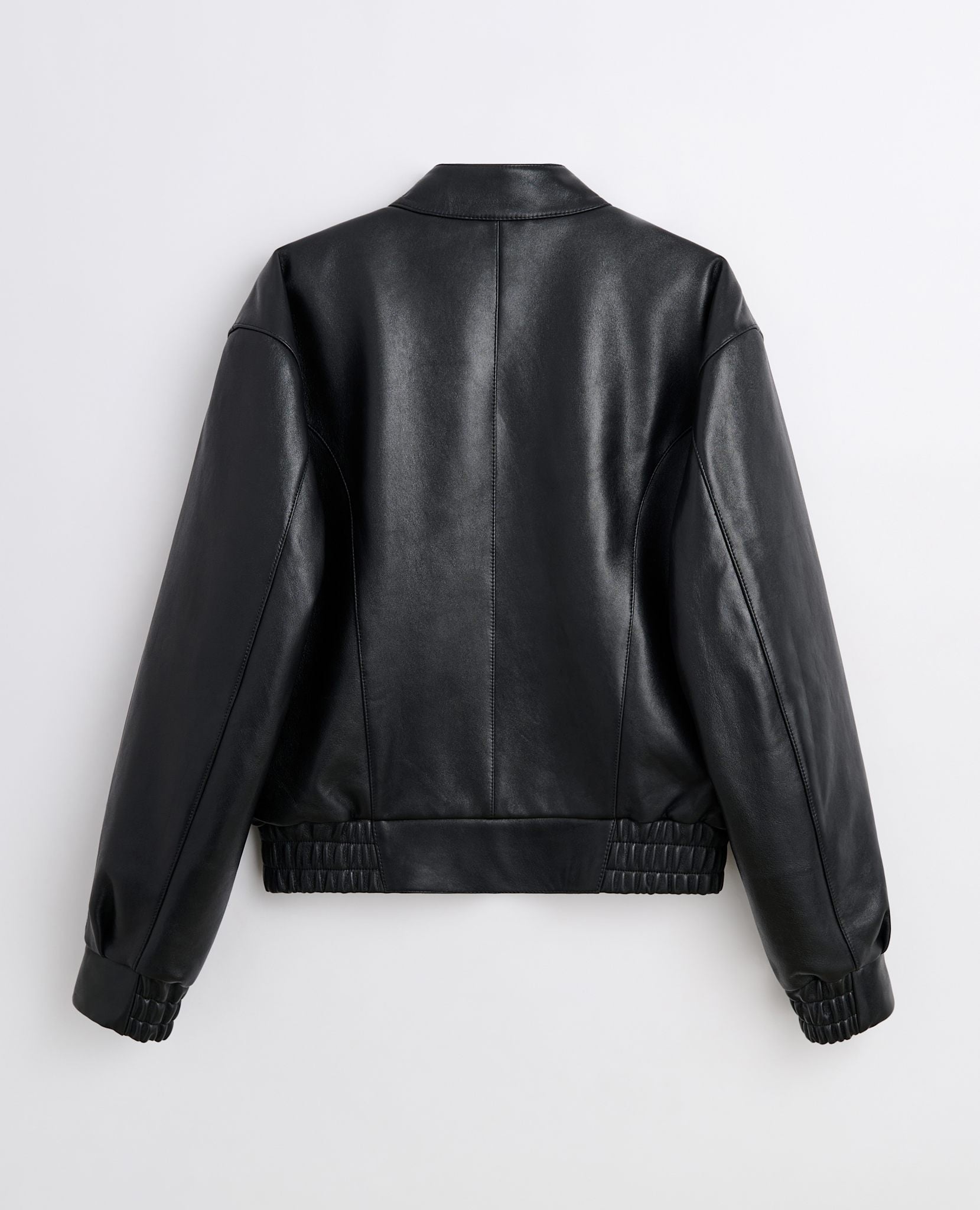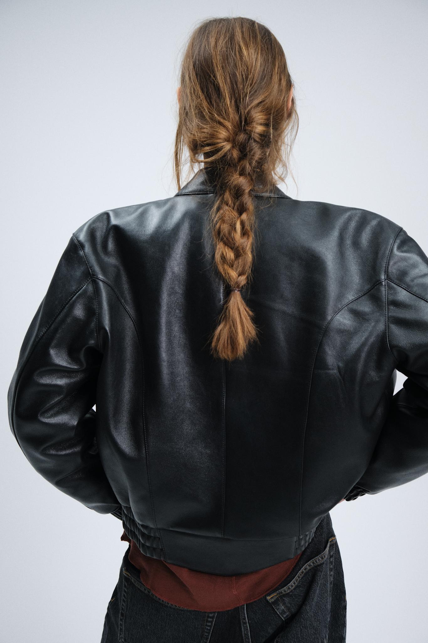 Short leather jacket with biker collar and elasticated bottom.