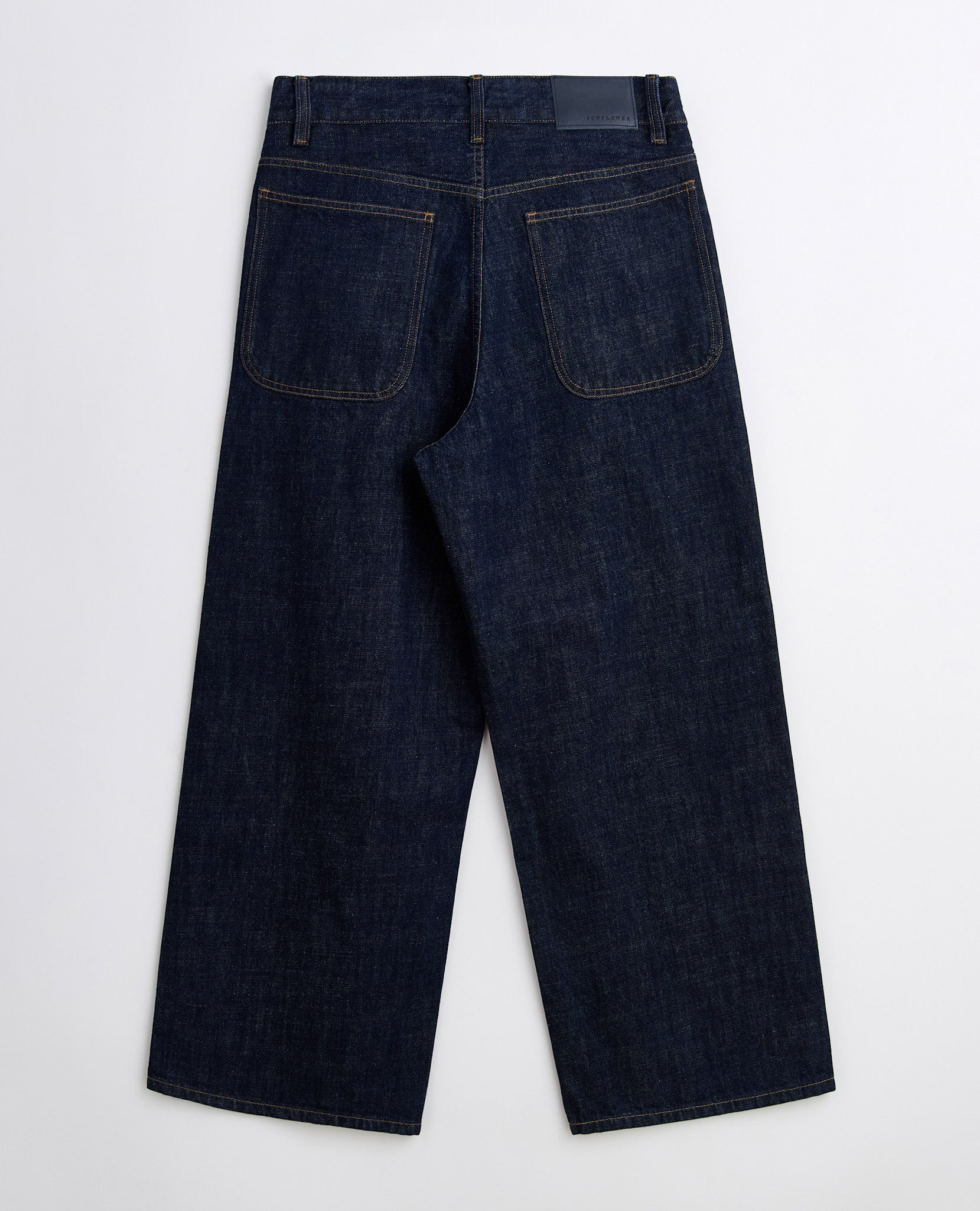 New super wide fit denim, classic at hip into a wider leg Sunflower metal trim Rounded workwear back pocketsItalian milled fabric 12,5 oz denimSlight rinse wash Wide leg 100% cotton