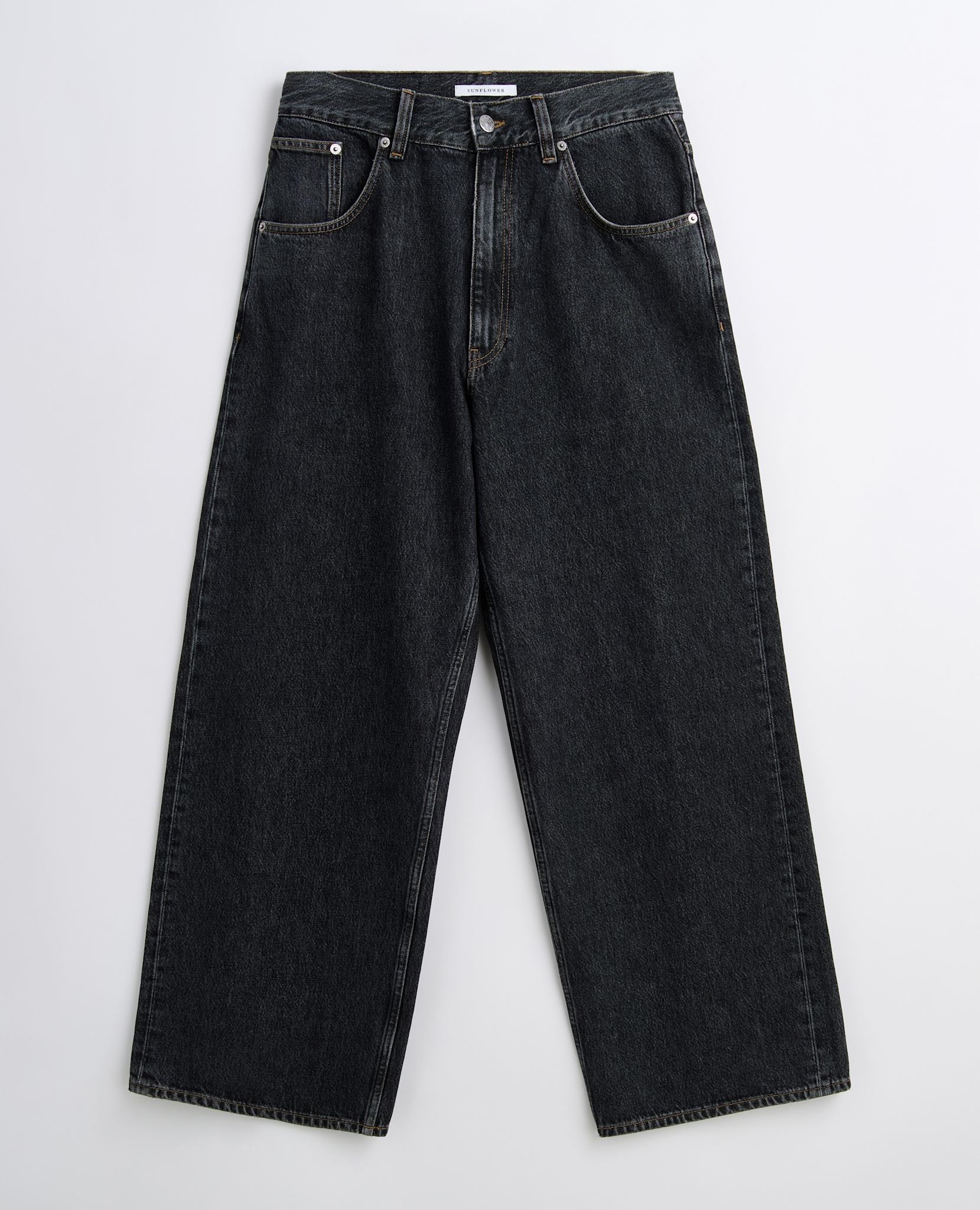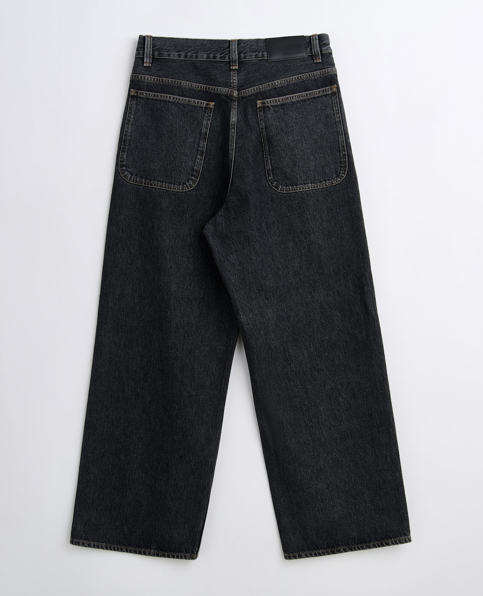 Stone washed black denim with tobacco contrast stitch in a wide legged fit fit