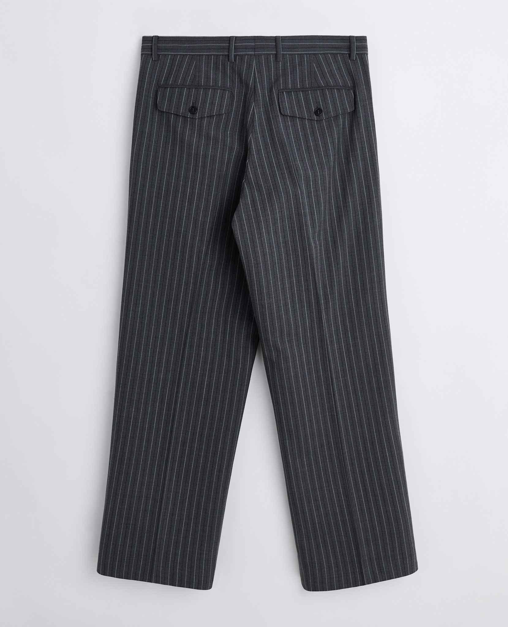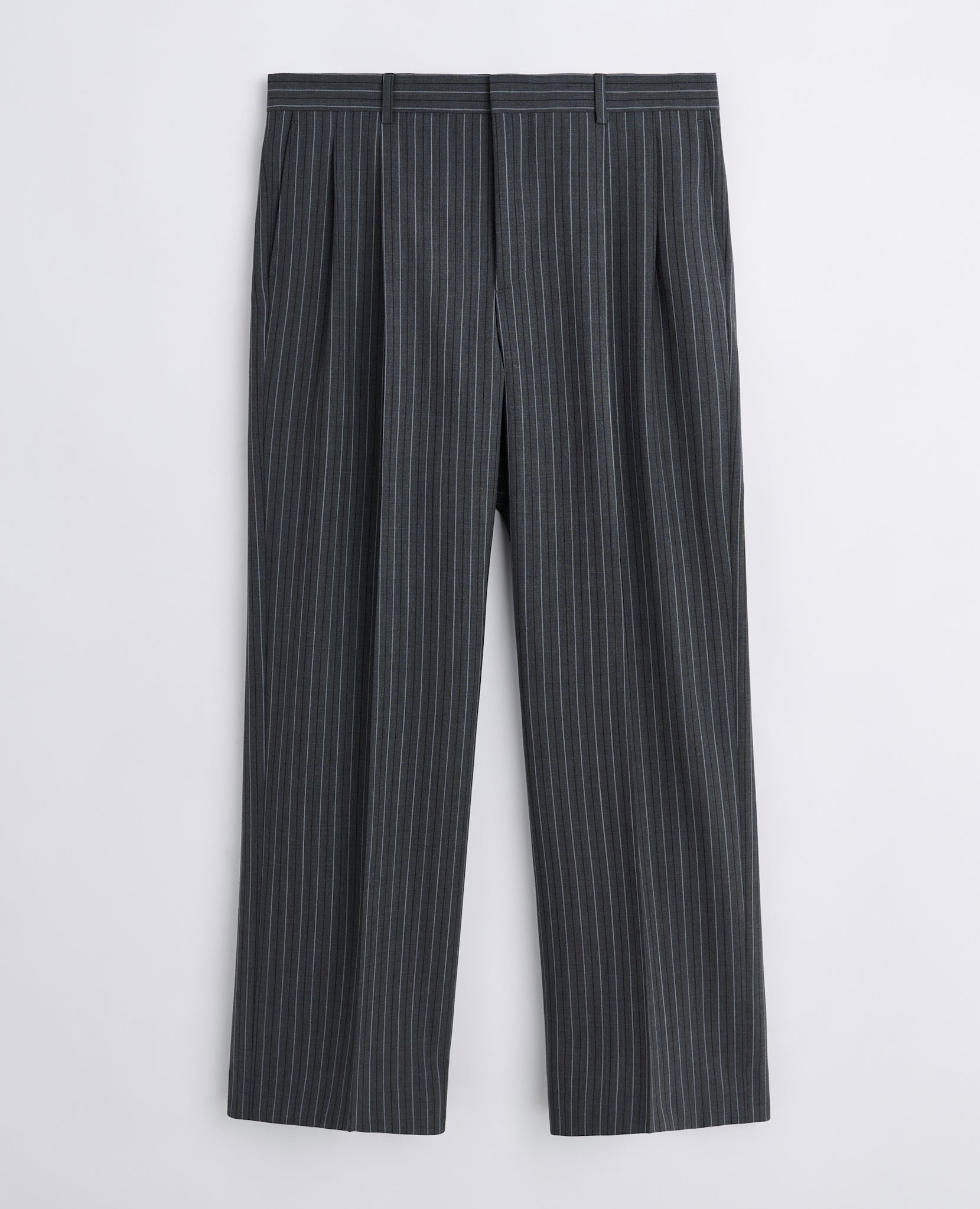Wide pleated trouser in a drapy yarn dyed wool mix fabric