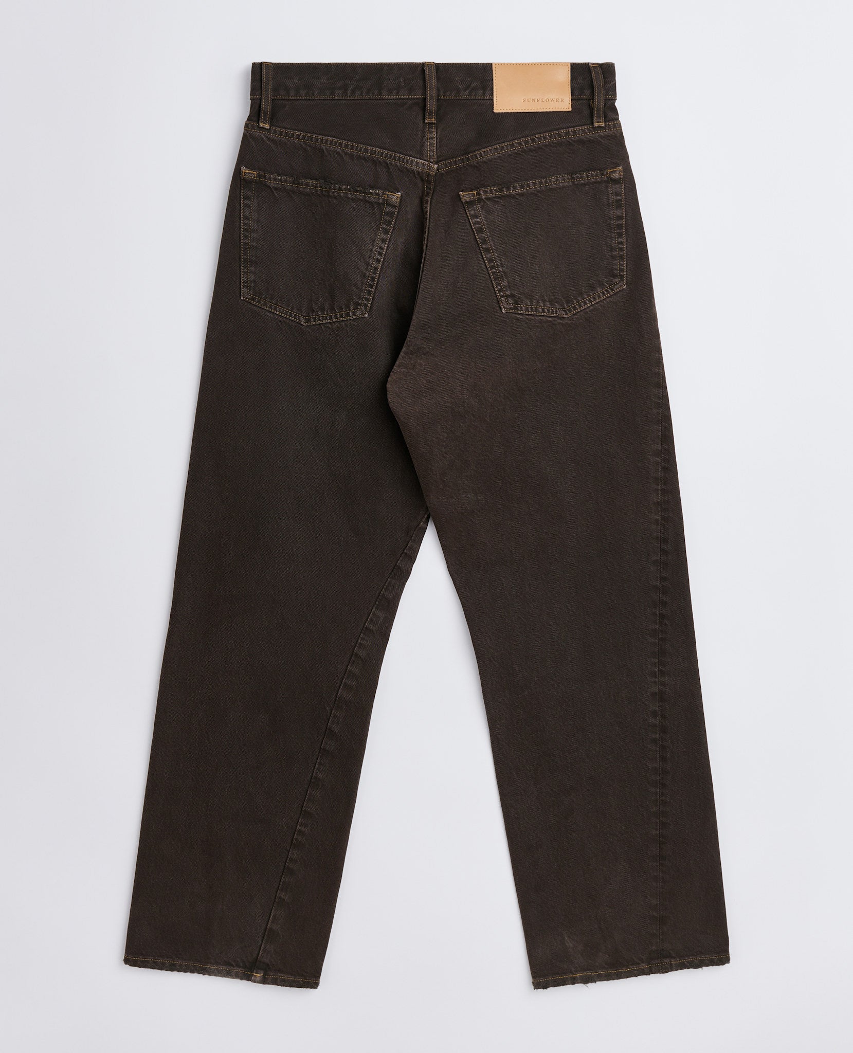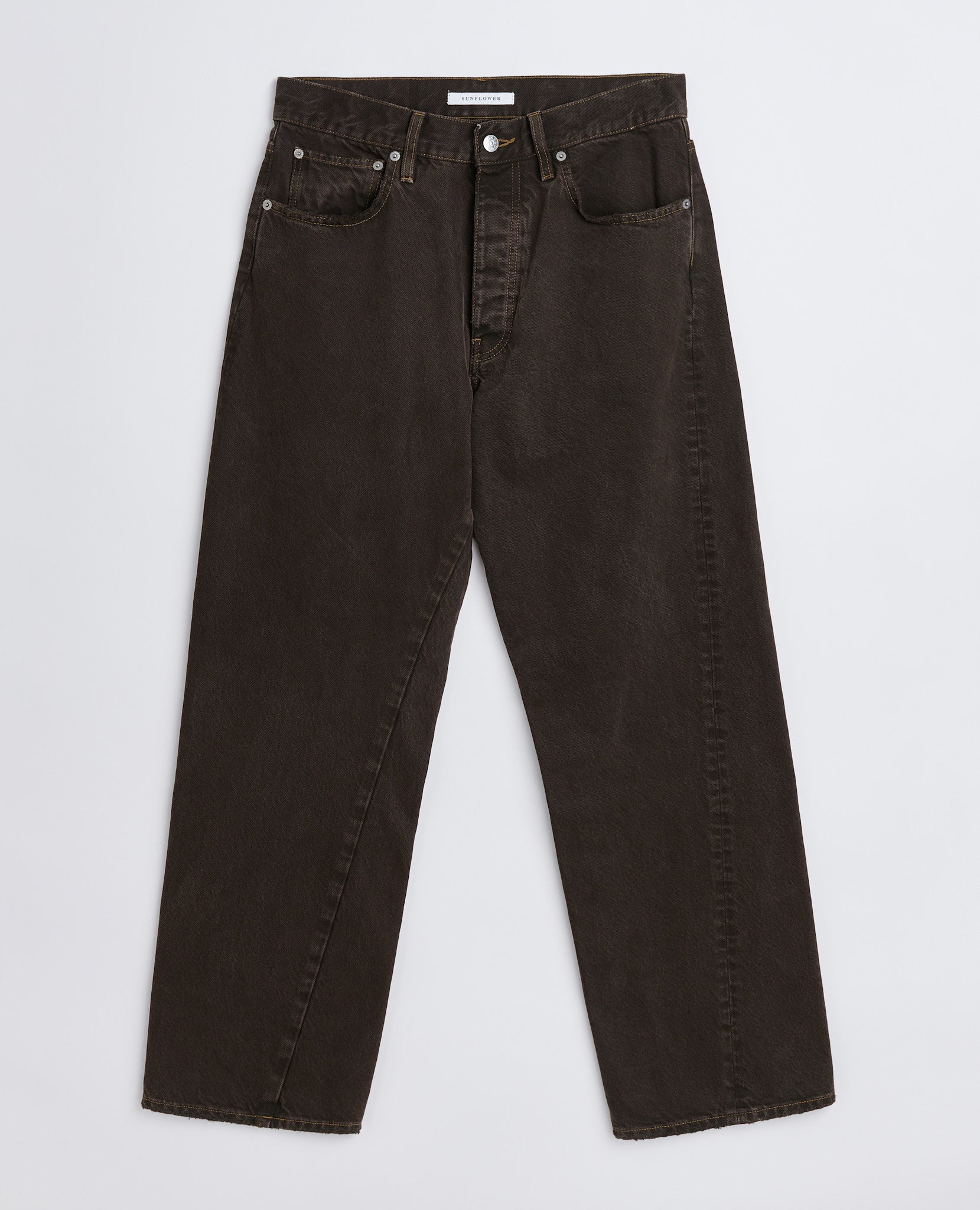 Loose fitted jeans, garment is dyed to dark brown and then heavily washed for the worn-in feel.