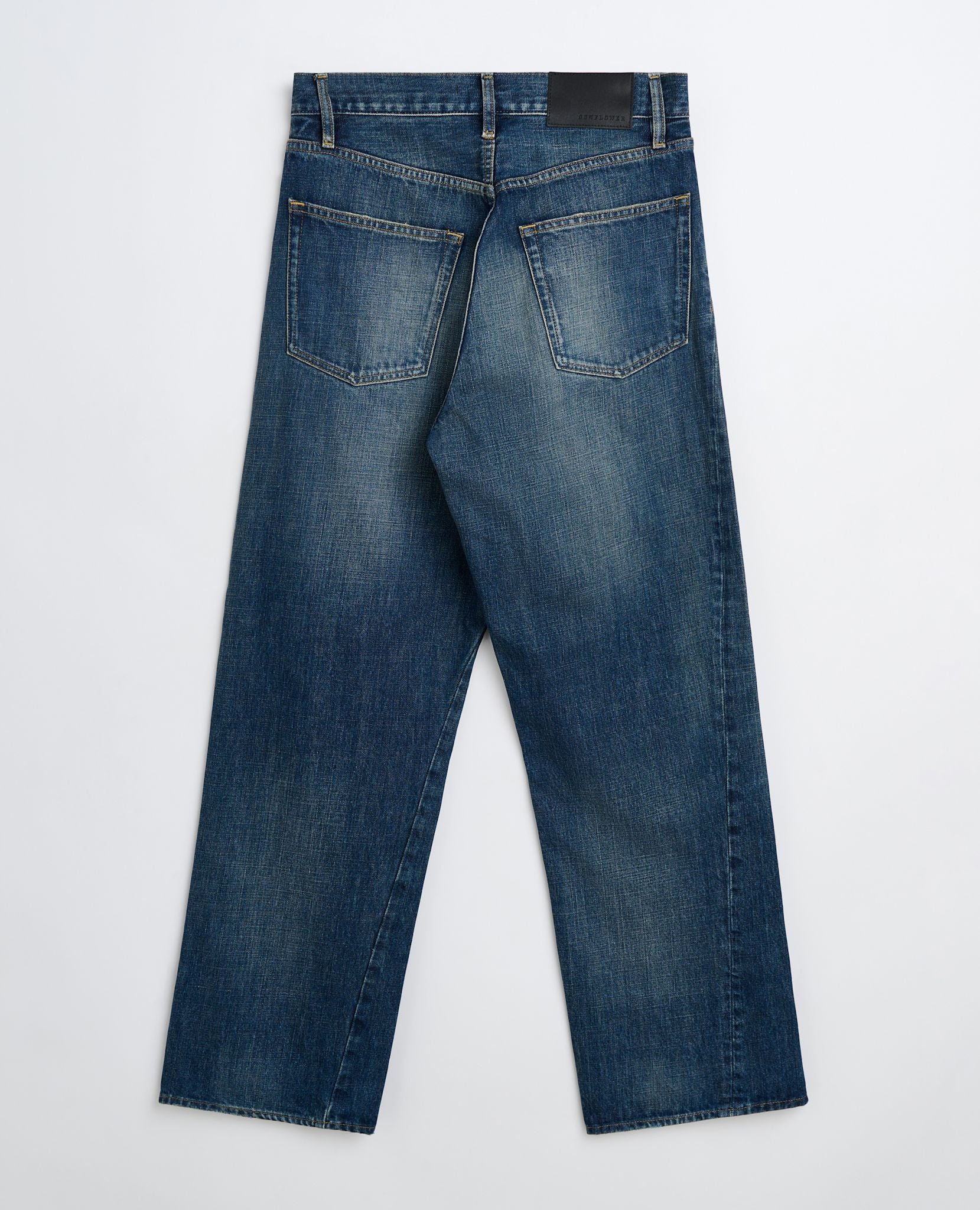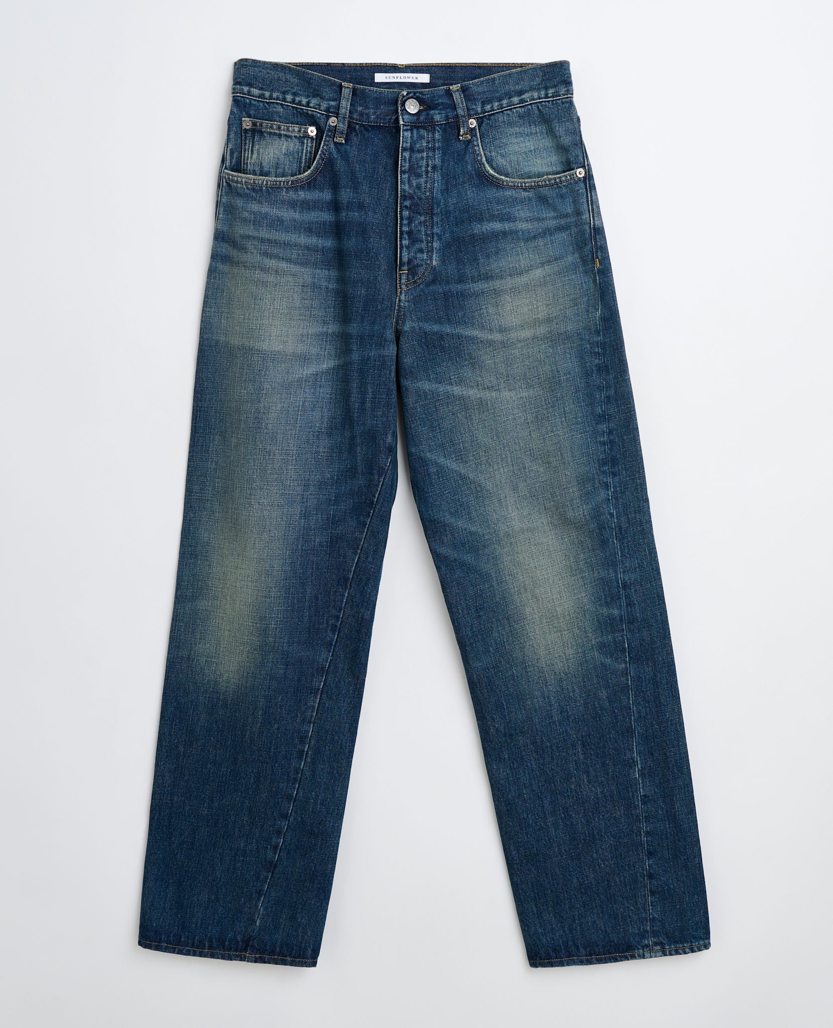 Loose fitted 5 pocket with twisted side seams in a dark vintage wash