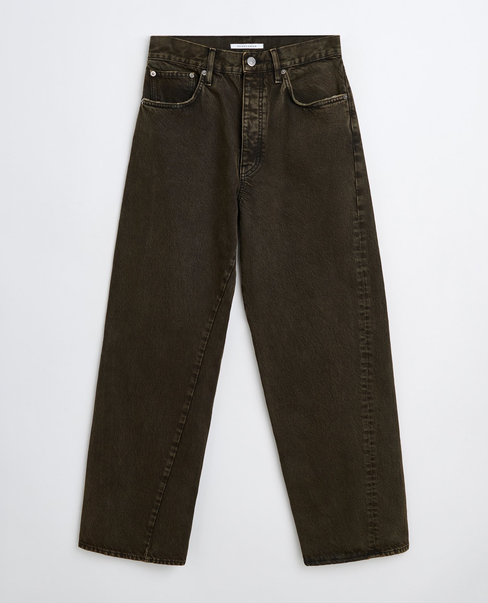 Wider fitted 5 pocket with twisted side seams in a dark over-dye.